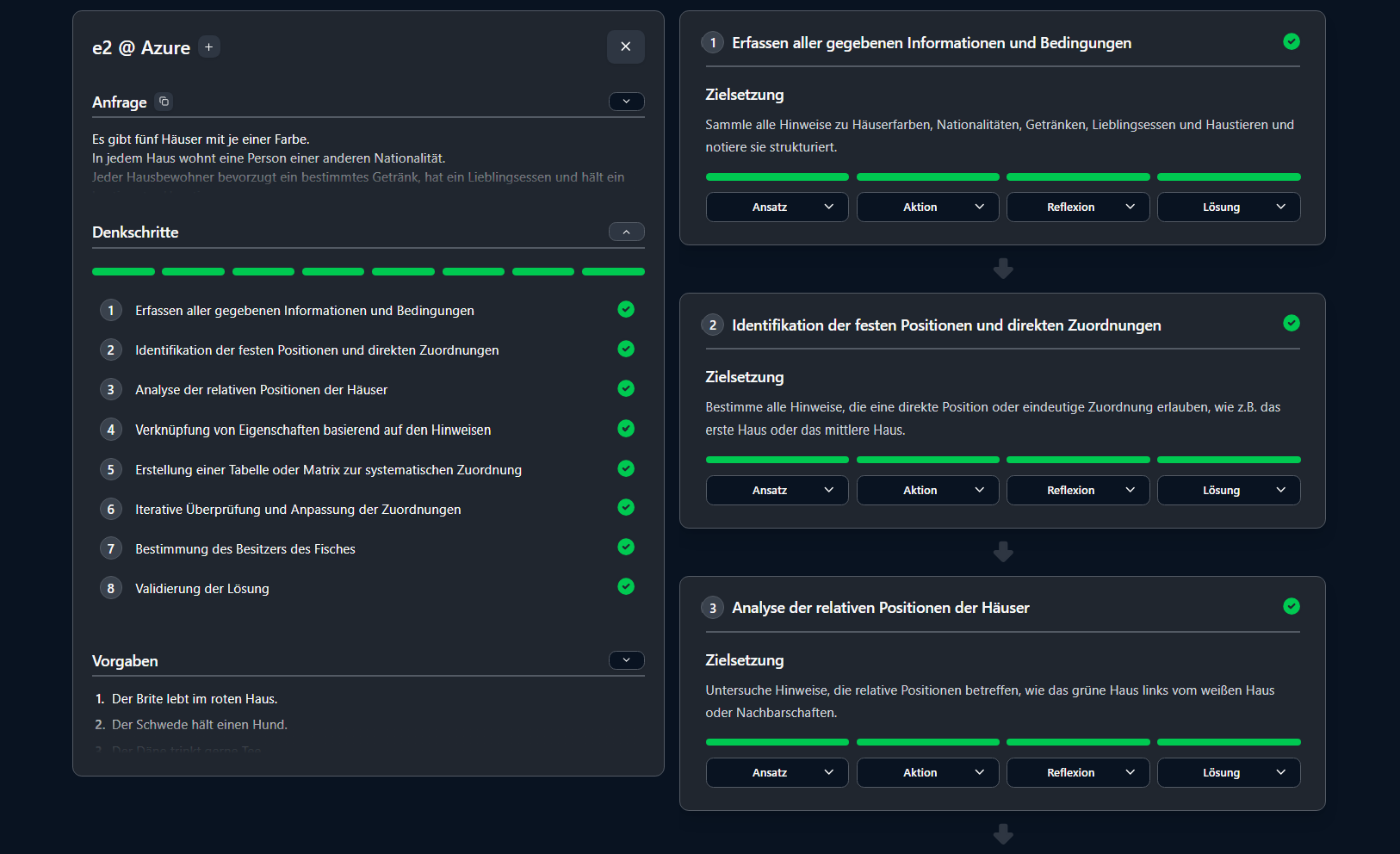 Anschließend analysiert und löst das System den Fall Schritt für Schritt. Ideal für mehrstufige, komplexe Prozesse, die logisches Schlussfolgern, Validierungen und detaillierte Herleitungen des Lösungswegs erfordern.